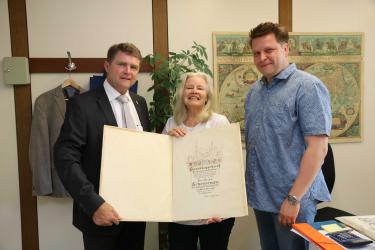 Die Enkelin, die in Neckartenzlingen wohnt, brachte auch den Ehrenbürgerbrief der Stadt Bretten aus dem Jahr 1955 mit ins Rathaus und die Urkunde zur Verleihung des Bundesverdienstkreuzes Erster Klasse, das dem Bürgermeister a.D. für besondere Verdienste vom ersten Bundespräsidenten der Bundesrepublik Deutschland, Theodor Heuss, im Juni 1956 verliehen worden war. Besonders erfreut aber zeigte sich Heide Schemenau darüber, als Oberbürgermeister Martin Wolff sie auf einem Stadtplan auf die Straße hinwies, die nach ihrem Großvater benannt ist. Bewegt erzählte sie die Geschichte, die sie nach Bretten geführt hatte. Anlass war nämlich eine Anfrage ihrer Schwester, die in Australien lebt. Deren Töchter behandelten in der Schule das Thema „Helden aus der Geschichte“ und stießen bei Recherchen auf den Urgroßvater Otto Karl Schemenau in Bretten.